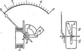 Электромагнитный измеритель (рис.6-3) имеет неподвижную катушку А и подвижную часть, состоящих из укрепленных на сои стального сердечника Б, указательной стрелки, пружины и алюминиевого сектора В успокоителя.