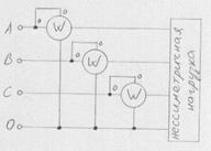 Рис.6-11. Схема включения ваттметров в четырех проводную трехфазную цепь при несимметричной нагрузке.