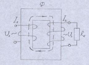 Работа трансформатора основана на явлении взаимной индукции. При подключении первичной обмотки в сеть переменного тока напряжением U1 по обмотке начнет проходить ток I1, который создаст в магнитопроводе переменный магнитный поток Ф. Этот поток, пронизывая витки вторичной обмотки, индуктирует в ней ЭДС (Е2), которую можно использовать для питания нагрузки. Так как, первичная и вторичная обмотки пронизываются одним и тем же магнитным потоком, то индуктируемые в них ЭДС определяются по формулам: