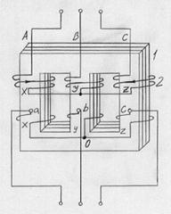 Принцип работы и электромагнитные процессы в трехфазном трансформаторе аналогичны рассмотренным выше. Особенностью трехфазного трансформатора является зависимость коэффициента трансформации линейных напряжений от способа соединения обмоток.