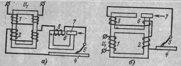 При первой форме исполнения (рис.7-5, а)первичная обмотка 1 рассчитана на стандартные напряжения U1 = 220 или 380 В. Вторичная обмотка 2, соединенная последовательно с отдельной реактивной катушкой 3, имеет при холостом ходе напряжение U2х = 70 В и при номинальном вторичном токе I2Н напряжение U2≈30 В. Сварочный ток между электродом 5 и изделием 4 регулируется изменением воздушного зазора 6 катушки 3 путем перемещения подвижной части сердечника 7.