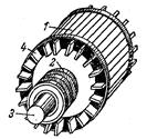 Внутри статора двигателя помещается его вращающаяся часть – ротор. Это цилиндр, набранный из стальных листов, как и статор, на поверхности которого имеются пазы. В пазы укладывается обмотка (медные стержни), замкнутая на торцах медными кольцами. Пазы в этом случае круглого сечения, а обмотка имеет вид клетки, называемой “беличьим колесом”.