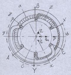 В статор уложена трехфазная обмотка, которая называется обмоткой статора. представляет собой три одинаковые катушки (три фазы AX, BY, CZ), но в отличие от трехфазных систем статора другое: первая фаза – С1, С4; вторая фаза – С2, С5; третья фаза – С3, С6. Поэтому, если обмотку статора надо соединить звездой, то С4, С5, С6 соединяют в одну точку к С1, С2, С3, подводят трехфазное синусоидальное напряжение. Если надо соединить треугольником, то С1 соединяют с С6; С2 с С4; С3 с С5 и в эти полученные точки подводят трехфазное синусоидальное напряжение. Двигатель соединяют звездой, если напряжение больше фазного напряжения двигателя в