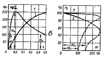 Наибольший (максимальный) момент Мм двигатель развивает при скольжении, называемом критическим (sкр≈0,2). При скольжении s=1 двигатель развивает пусковой вращающий момент Мп.