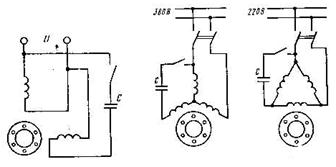Иногда в качестве однофазного используют трехфазный асинхронный двигатель, у которого в цепь одной из обмоток статора включен конденсатор (рис. 9-18).