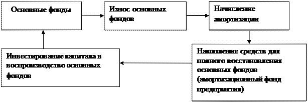 Основные фонды предприятия совершают хозяйственный кругооборот, который состоит из следующих стадий: износ основных фондов, амортизация, накопление средств для полного восстановления основных фондов, их замена путем осуществления капитальных вложений (рис. 11).