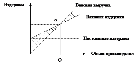 В точке О объем произведенной продукции, будучи реализованным по сложившимся на рынке ценам (Ц), покроет расходы, связанные с производством этого объема, т.е. прибыль будет равна нулю.
