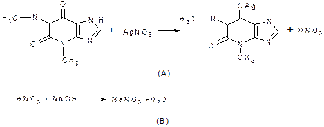 ПРИМЕР: Рассчитайте содержание теофиллина (Mr=180,17) в таблетках, если после добавления к навеске порошка растертых таблеток массой 0,3026 г (а) 25,0 мл 0,1 моль/л раствора серебра нитрата (К=0,99) на титрование выделившегося эквивалентного количества азотной кислоты затрачено 12,6 мл (V0 0,1 моль/л раствора натрия гидроксида (К=1,01). Средняя масса одной таблетки 0,3425 г.