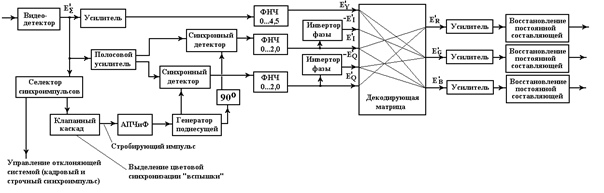 Синхронизация генератора поднесущей декодера через схему цветовой синхронизации.