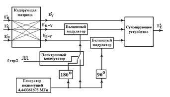 - модуляция осуществляется сигналами 0,493 ЕB-Y и 0,877 ER-Y