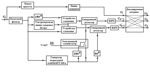 Для правильного детектирования необходимо совпадение фаз опорного сигнала с сигналом цветности, поэтому применяют – фазоинверторы.