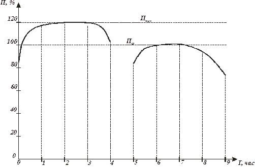 Рис.1. Изменение производительности человеческого труда в течение смены.
