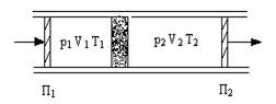 В опыте использовалась теплоизолированная трубка, разделенная пористой перегородкой, по обе стороны от которой находился газ (рис.19). Газ под действием разности давлений медленно протекал через перегородку, при помощи поршней П1, П2 в этих условиях в каждый момент времени газ находился в термодинамически равновесных состояниях, давление p1, p2 по разные стороны перегородки поддерживалось постоянным.