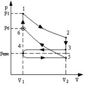 2.8. Найти КПД четырехтактного двигателя внутреннего сгорания. Считать, что смесь воздуха и бензина, и воздуха с продуктами сгорания с достаточной точностью ведет себя как идеальный газ с показателем адиабаты γ. Двигатель работает по циклу Отто (рис.12), где 1-2 – адиабата, 2-3 – изохора, 5-6 – адиабата, 6-1 – изохора, т.к. в данном случае цикл идеальный, считаем, что 5 совпадает с 3, путь 3-4 совпадает с 4-5 и работа на 4-5 не совершается.