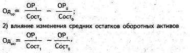 где Сост1 и Сост0 — средние остатки оборотных средств соответственно в отчетном и прошлом году; ОР1 и ОР0 — выручка от реализации продукции (работ, услуг) соответственно в отчетном и прошлом году.