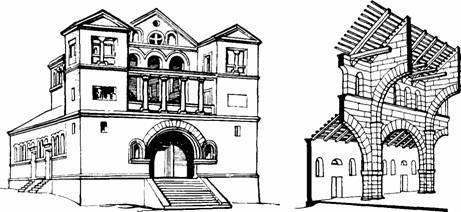 Деревянные стропильные фермы раннехристианских базилик перемежались каменными арочными перемычками, как в базилике Турманина. Эта базилика интересна еще и размещением главного входа между двумя башнями. Прием этот будет подхвачен и развит романской и готической архитектурой Европы.