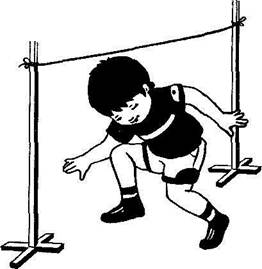 Лазанье под шнур выполняется также двумя шеренгами. Дети по очереди подходят к шнуру, приседают и стараются, не касаясь руками пола и не задев за шнур, пройти под ним (рис. 1). Повторить 3-4 раза.