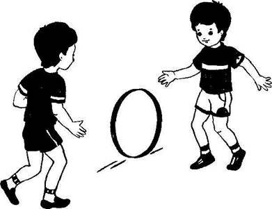 «Прокати обруч». Дети строятся в две шеренги, расстояние между шеренгами 4-5 м. В руках ребят одной шеренги обручи (диаметр 50 см). По сигналу воспитателя каждый ребенок прокатывает обруч партнеру из второй шеренги, а тот возвращает обруч обратно, и так несколько раз подряд (рис. 2).
