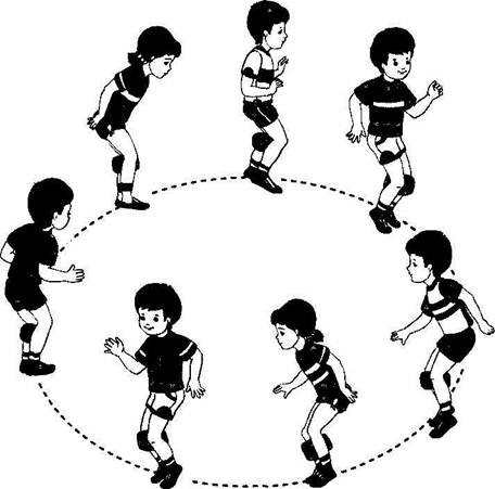 «Пингвины». Играющие образуют круг. У каждого ребенка мешочек, который он зажимает между колен (рис. 5). По сигналу воспитателя дети начинают прыжки на двух ногах, продвигаясь по кругу. Через 30 секунд остановка, поворот в другую сторону и продолжение прыжков. Повторить 2—3 раза.