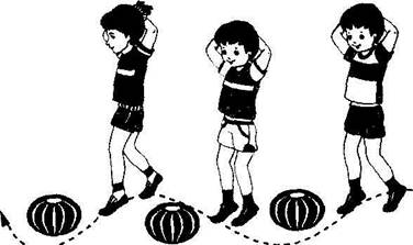 3. Равновесие. Ходьба на носках, руки за головой между набивными мячами, положенными в одну линию (6—8 шт.) (рис. 7). Выполняется двумя колоннами.