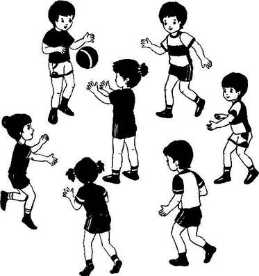 «Мяч водящему». Играющие образуют 3—4 круга, встают по кругу на расстоянии одного шага друг от друга. В центре каждого круга находится водяший, который поочередно бросает мяч игрокам, а те возвращают его обратно. Как только все играющие выполнят упражнение, водящий поднимает мяч высоко над головой. Игра повторяется 2-3 раза со сменой водящих (рис. 10).