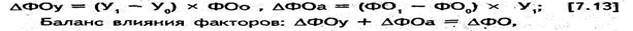 где ΔФОа — изменение фондоотдачи основных производственных средств за счет изменения отдачи активной части основных средств (машиноотдача); ΔФОу - изменение фондоотдачи основных производственных средств за счет изменения удельного веса активной части основных средств; ФО1 и ФО0 — фондоотдача активной части основных производственных средств, соответственно в отчетном году и предшествующем году; У1; Уо — удельный вес активной части основных производственных средств, соответственно в отчетном году и в предшествующем году (У = стоимость активной части основных производственных средств / общая стоимость основных производственных средств); ΔФО — изменение фондоотдачи по сравнению с предшествующим годом (ФО1 — ОФ0).