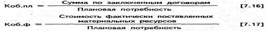 Для оценки обеспеченности потребности в материальных ресурсах договорами на их поставку сравнивают фактическое количество закупленного сырья и материалов с их плановой потребностью. Кроме этого по каждому виду материалов рассчитывают коэффициент обеспеченности по плану (Коб.пл) и коэффициент обеспеченности фактически (Коб.ф)
