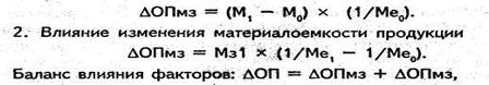 где М0 и М1 — стоимость материальных затрат, соответственно в базисном и отчетном периодах; Ме0 и Me1 — уровень материалоемкости соответственно в базисном и отчетном периодах; ΔОП — изменение объема продукции (ОП1 — ОП0).