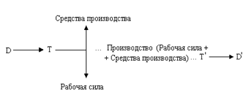 Маркс начинает с тезиса о том, что деньги представляют собой последний пункт процесса развития товарного обращения. Вместе с тем они служат исходным пунктом возникновения капитала. Маркс доказывает, что деньги как деньги и деньги как капитал отличаются принципиально. Сравнивая формулу простого товарного обращения (Т – D –Т) с всеобщей формулой движения капитала (D – Т – D′), Маркс приходит к некоторым выводам:
