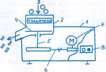 Основные части: 1. корпус , 2 рабочая камера , 3 загрузочное окно , 4 нож , 5 вал , 6 ремённая передача , 7 электродвигатель , 8 пульт управления (кнопочная станция).