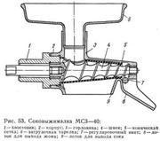 Принцип действия: на ходу машины очищенные ягоды (фрукты) загружаются в рабочую камеру, раздавливаются шнеком, сок через коническую сетку и лоток 9 стекает в подготовленную тару, а жом через лоток 8 удаляется из рабочей камеры. Степень влажности жома регулируется винтов 7.