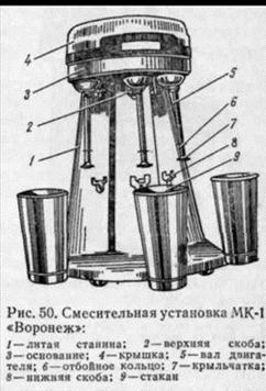 | Машина состоит из корпуса- литой станины, в верхней части которой смонтированы три трёхскоростных электродвигателя. Валы электродвигателей выведены наружу, на конце каждого вала имеются крыльчатка и отбойное кольцо. На корпусе машины смонтированы три верхние скобы под которыми смонтированы микровыключатели для включения двигателя в работу и три нижние скобы для установки стаканов. В комплект к машине входит три стакана ёмкостью по 1 литру. На крышке машины смонтированы переключатели для изменения скорости вращения электродвигателей. Принцип действия: при включении электродвигателя крыльчатка подбрасывает продукт вверх, а отбойное кольцо отбивает вниз, происходит интенсивное перемешивание жидкостей, насыщение воздухом, увеличение объёма напитка. Правила эксплуатации: перед работой проверяют санитарное и техническое состояние машины, включают в электросеть через штепсельный разъём с заземлением, |