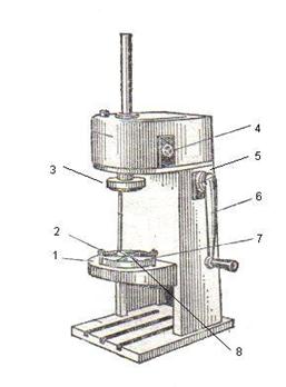 Принцип действия: на основание устанавливается сосуд с холодной водой, на фильеру крепят цилиндр, заполненный охлажденным до 8º - 10º сливочным маслом, поршень при этом находится в верхнем положении. Устанавливают массу кусочков с помощью регулировочного механизма. При вращении ручки через систему рычагов движение передаётся на поршень, он перемещается вниз, продавливает блок масла через фильеру, а струнный отсекатель совершает возвратно, поступает движение по горизонтали и отрезает кусочки масла определённой высоты. Нарезанные кусочки падают в сосуд с холодной водой, чтобы не слипались.