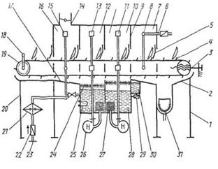 | Основные части 1.Корпус 4. Загрузочный стол 5. Транспортёр 6.Душ струйной очистки посуды 7. Зона 9. Резиновые шторки 10. Зона мойки 11, 13, 15. душ 12. Зона первичного ополаскивания 16. Зона вторичного ополаскивания 17. Наклонная плоскость для слива воды 18. Планка транспортёра 21 водонагреватель 25. Ополаскивающая ванна с теном 26 насос с фильтром 28 моечная ванна 29 соленоидный клапан 30. Бак для моющего средства 31 бак для сбора остатков пищи |