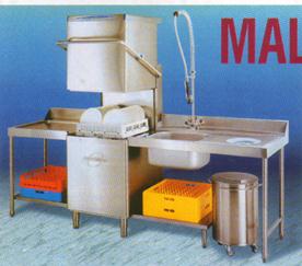- машину обслуживают два оператора: первый очищает посуду от крупных остатков пищи и устанавливают на транспортёр на загрузочном столе. Посуда с помощью транспортёра перемещается из зоны в зону.