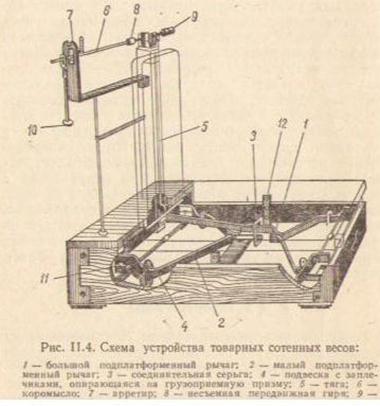 Весы состоят из рамы, в которой смонтированы большой и малый платформенные рычаги, соединённые серьгой. Рычаги опираются на призмы и подушки. Большой рычаг с помощью тяги соединяется с неравноплечим коромыслом, которое опирается на стойку. На малом плече коромысла по резьбе перемещается тарировочный груз 9, с его помощью весы уравновешиваются перед работой большое плечо коромысла имеет шкалу, по которой передвигают гирю 8., на конце коромысла имеется гиредержатель для установки условных гирь.