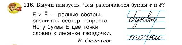 – На предыдущем уроке мы изучали букву е. Из стихотворения вы уже знаете, что у этой буквы есть сестра – буква ё. Сегодня на уроке мы выучим букву ё, узнаем, какие звуки она обозначает на письме, будем учиться читать и писать слова с буквой ё.