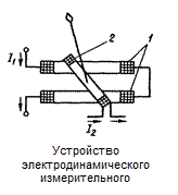 Электродинамический измерительный механизм (рис.) имеет две последовательно соединенные неподвижные катушки1, разделенные воздушным зазором, и подвижную катушку 2. Ток к подвижной катушке подводится через пружинки, создающие противодействующий момент.