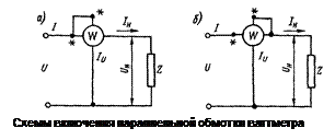 В этом случае (см. рис., а) последовательно соединенные неподвижные катушки 1 включают последовательно с объектом Z, потребляемая мощность которого измеряется. Подвижная катушка 2 с добавочным резистором включается параллельно объекту. Цепь неподвижных катушек называют последовательной цепью, а цепь подвижной катушки — параллельной цепью.