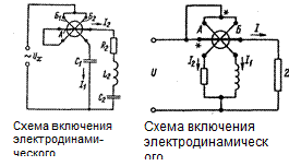 Частотомеры. В электродинамических частотомерах применяют логометрический измерительный механизм. Схема включения частотомера представлена на рис..