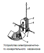 Измерительный механизм. Вращающий момент в этих механизмах возникает в результате взаимодействия одного или нескольких ферромагнитных сердечников подвижной части и магнитного поля катушки, по обмотке которой протекает ток. В настоящее время наибольшее применение получили конструкции измерительных механизмов с плоской катушкой, с круглой катушкой и с замкнутым магнитопроводом. На рис. показан механизм с плоской катушкой.