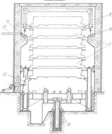 Вертикальные пропарочные камеры. В поисках способа более рационального использования теплоты и уменьшения площади цеха проф. Л. А. Семенов предложил вертикальную пропарочную камеру, схема которой лриведена на рис. 5.15. Принцип работы такой камеры заключается в следующем. Изделие в форме 1 по приводному рольгангу 2 проходит до положения 3, показанного пунктиром, в камеру 4, состоящую из бетонной коробки 5, покрытой теплоизоляционным слоем 6. Сверху бетонную коробку 5 покрывают герметичной стальной крышкой 7. В положении 3 изделие останавливается концевым выключателем. Этот же концевой выключатель включает в работу загрузочные гидродомкраты 14. Они поднимают изделие из положения 3, при этом форма с изделием утапливает защелки 13, а штабель оказывается выше защелок. занимают положение, показанное на рисунке. После выхода защелок гидродомкраты начинают опускаться вниз, проходят между защелками, оставляя штабель изделий на защелках. Пока такие камеры применяют лишь на ограниченном числе предприятий