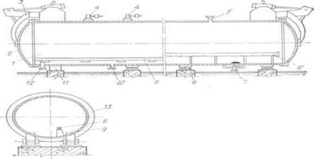 Автоклавные установки представляют собой герметически закрывающиеся сосуды цилиндрического типа, рассчитанные на тепловлажностную обработку изделий паром под давлением порядка 0,8—1,3 МПа. Внутренний диаметр современных автоклавов 3,6 м, длина корпуса 21 м, они так называемого проходного типа. В такой автоклав поезд из вагонеток заталкивается с одного конца, а через другой после работы выгружается готовая продукция. На рис. 10.6 схематически показанавтоклав, состоящий из корпуса I с теплоизоляцией 13 и его оборудования. К оборудованию относятся две быстро закрывающиеся крышки 2, механизм, закрывающий и открывающий крышки 3, два предохранительных клапана 4, патрубок ввода пара 12, патрубок для вывода конденсата 7, патрубок для включения в вакуум-систему 10 и патрубок для перепуска пара 5. Сам корпус устанавливают на опоры, одна из которых закреплена неподвижно—У/, а остальные — подвижные 5, что позволяет корпусу при тепловом расширении передвигаться по ним. В корпусе для загрузки вагонеток на специальных опорах смонтирован рельсовый путь 9 с колеей 1524 мм. Внизу между рельсами во всю длину корпуса вмонтирована перфорированная труба 6, соединенная с патрубком ввода пара и предназначенная для раздачи пара в автоклаве.