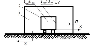 Бетон в виде модельного параллелепипеда 2 (см. схему приведенную на рис. 11.2) поместим в установку 1 и обозначим локальную температуру и влагосодержание материала соответственно на поверхности tп.м и Uп.м и в центре tц.м и UЦМ. В установку подадим пар П и из установки будем выводить конденсат К. Пар будет отдавать теплоту парообразования, нагревать поверхность материала и тепловую установку за счет конденсации на поверхностях материала и установки. Этот процесс, как уже было сказано, называется процессом внешнего, по отношению к материалу и установке, тепло- и массообмена. Рассмотрим процесс внешнего тепло- и массообмена между паром и материалом.