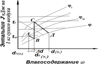Рассмотрим процесс испарения влаги в пузырек воздуха на i-d-диаграмме (рис. 11.4).