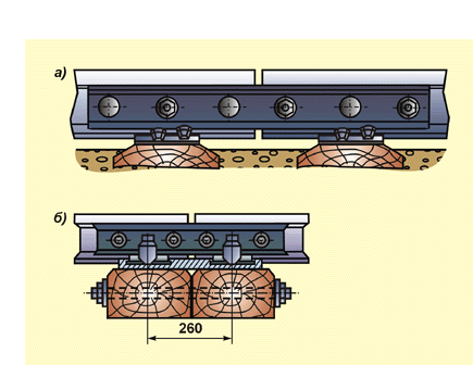 2.Стык на сдвоенных шпалах - когда обе стыковые шпалы сближены до соприкосновения и стянуты болтами.