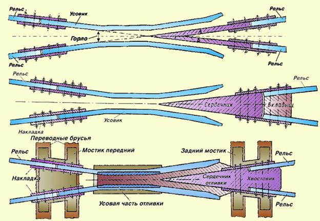 Крестовины с подвижным сердечником имеют два усовика в единой отливке из высокомарганцовистой стали. Подвижной сердечник состоит из двух ветвей разной длины, которые изготовлены из остряковых рельсов типа ОР65 массой 83,8 кг/м. головки этих рельсов на заводе закаливают с нагревом токами высокой частоты. Ветви сердечника у острия после вертикальной и горизонтальной механической обработки соединяют шестью горизонтальными болтами.