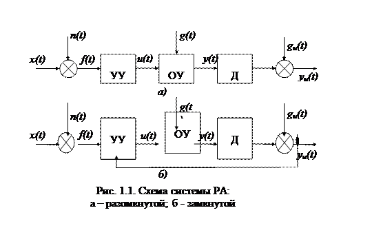В зависимости от принципа формирования сигнала управления u(t) различают два основных вида систем РА: разомкнутые и замкнутые. В разомкнутых системах (рис1.1, а) сигнал управления зависит только от управляющего воздействия: