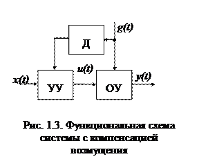 Существуют также системы, работающие по принципу компенсации возмущающих воздействий (рис. 1.3). В таких системах возмущающее воздействие измеряется датчиком (Д) и используется для формирования сигнала управления u(t). При выполнении определенных соотношений можно добиться того, чтобы выходной сигнал не зависел от возмущающего воздействия g(t), что является достоинством таких систем управления.