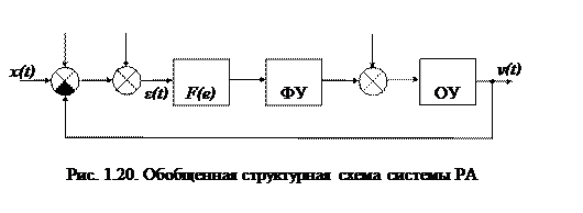 Сравнивая различные системы РА, рассмотренные в п.п. 1.2—1.6, нетрудно установить, что их структурные схемы во многом повторяют одна другую. Аналогия структурных схем систем РА позволяет составить их обобщенную структурную схему (рис. 1,20). На этой схеме приняты следующие обозначения: x(t) — входной сигнал или управляющее воздействие (угол поворота линии визирования в системе автоматического сопровождения цели РЛС, частота эталонного генератора в системе фазовой подстройки частоты и т. п.); y(t) —выходной сигнал илирегулируемый параметр (угол поворота антенны РЛС, частота перестраиваемого генератора); e(t) - сигнал рассогласования, или сигнал ошибки. Работа систем РА происходит в условиях действия различных помех